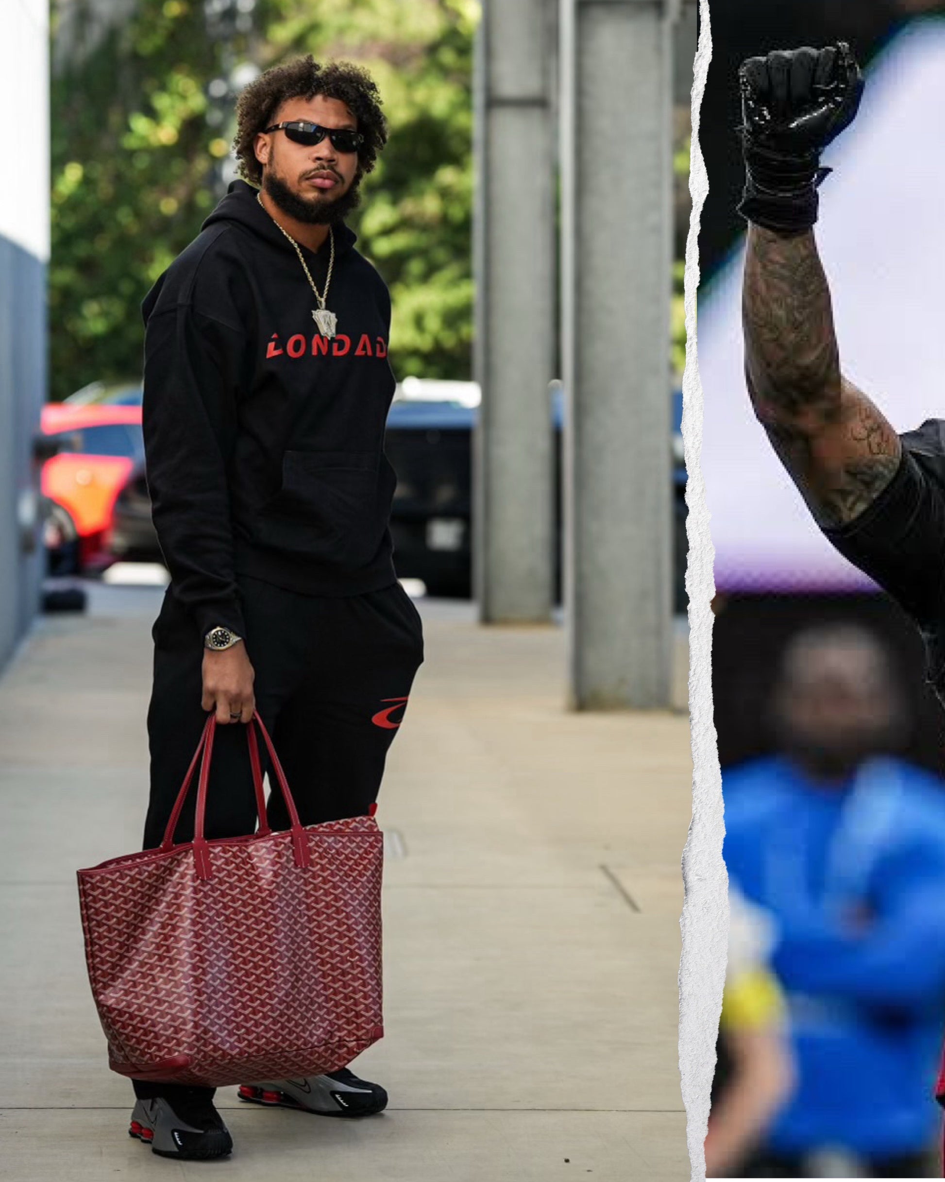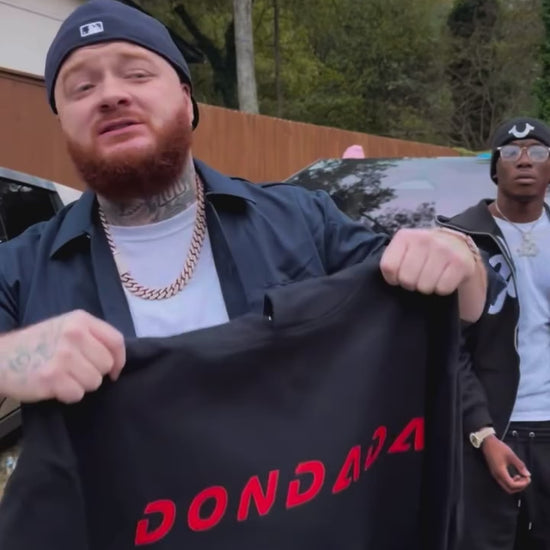 Black fleece sweatsuit w/ red DONDADA branding. Heavyweight, high quality, everyday luxury.