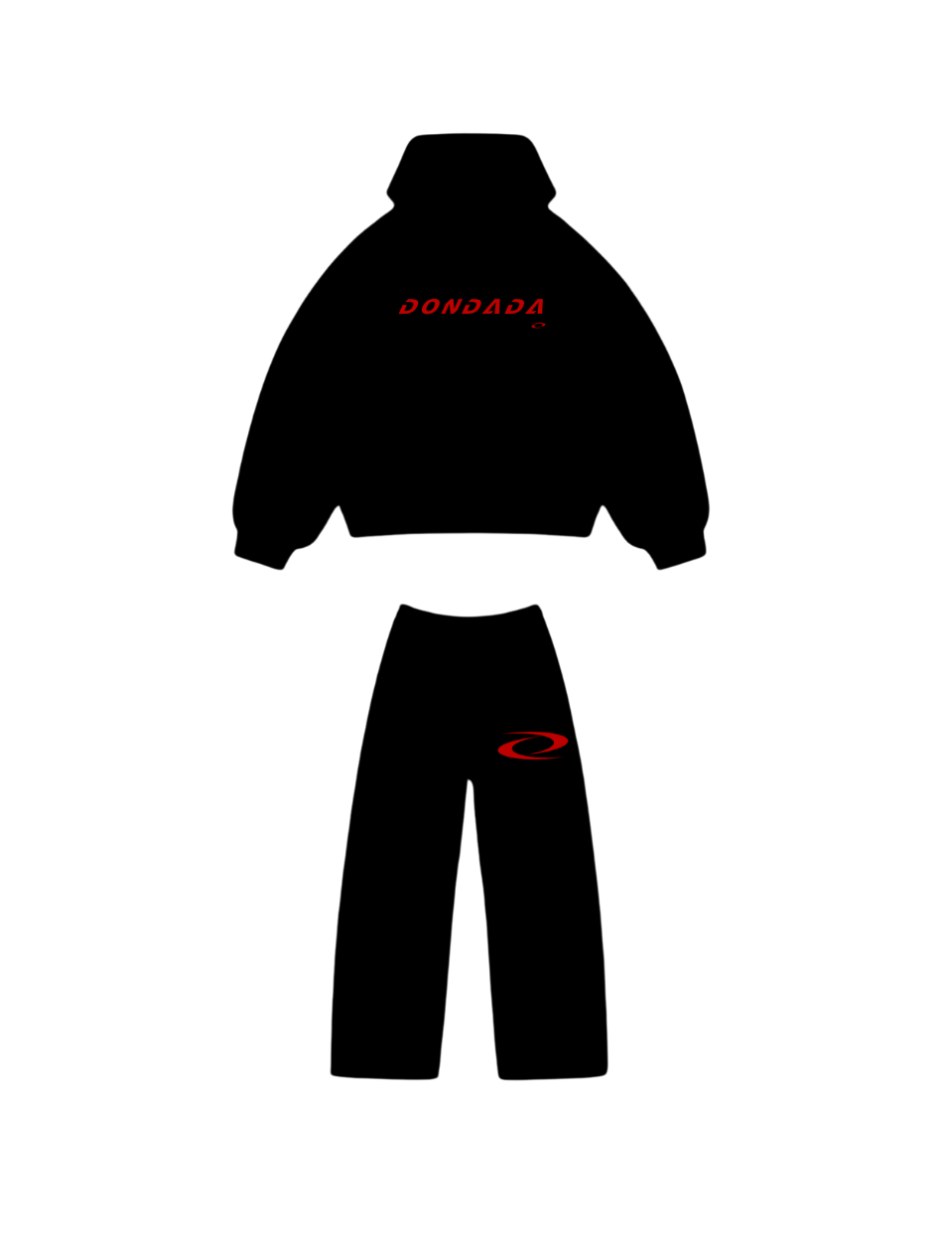 Black fleece sweatsuit w/ red DONDADA branding. Heavyweight, high quality, everyday luxury.