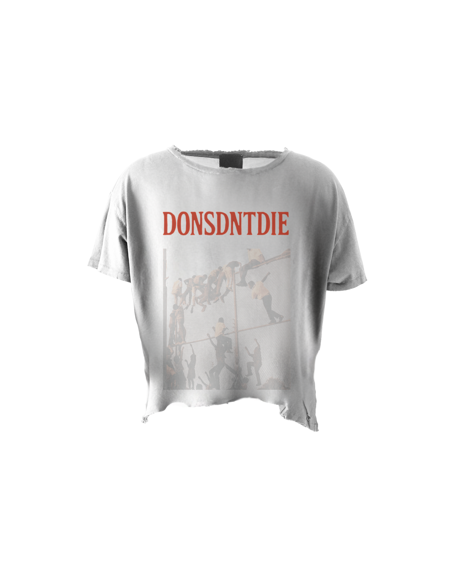 Vintage distressing, raw hem, and our signature bold red DONSDNTDIE stamp — because no matter how high the fence, we find a way over.
