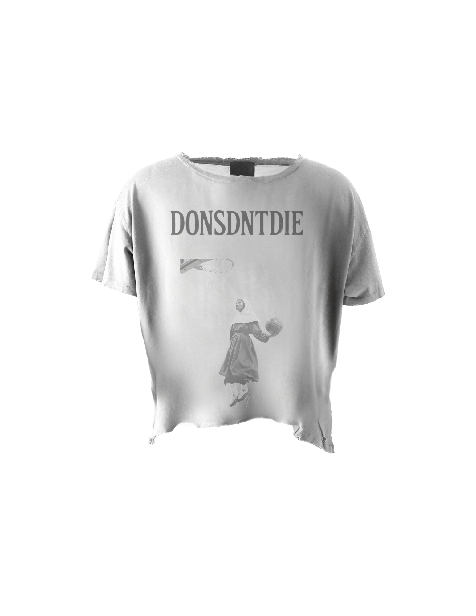 A nun mid-dunk — suspended in defiance, grace, and flight. This tee captures that raw moment where the sacred meets street, blending irony, belief, and basketball into one surreal vision.